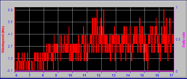 | Maximum Gust (since 0 hour ) | 34.2 kmh (18.5 kts) at: 11:41 AM | Maximum 1 minute average (since 0 hour ) | 15.6 kmh (8.4 kts) at: 11:42 AM |