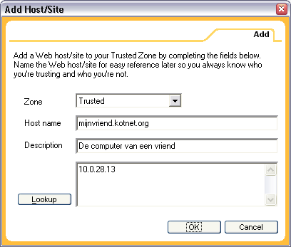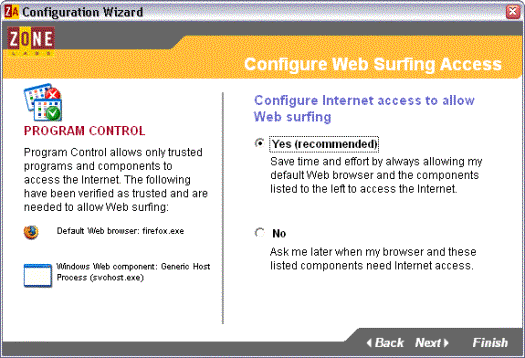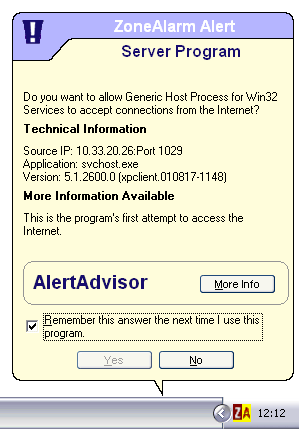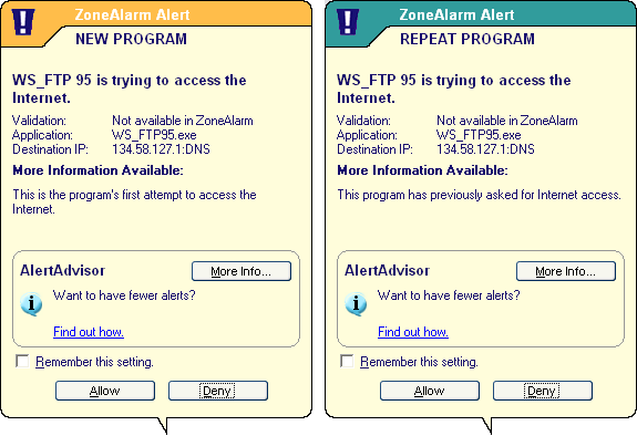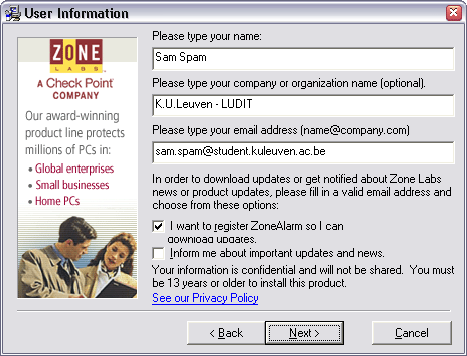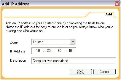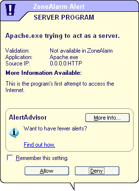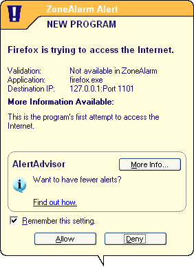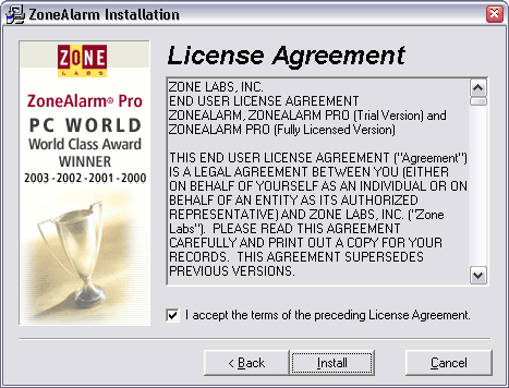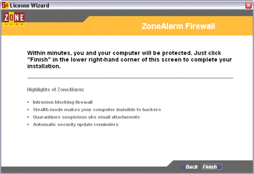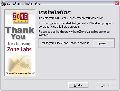 ZoneAlarm is een van de populairste Persoonlijke Firewalls. Dubbelklik op .exe file om het programma te installeren. Na installatie nestelt het programma zich in de 'Opstart'-groep, zodat het programma steeds op de achtergrond zijn werk doet wanneer je Windows opstart. Het programma leert gaandeweg. Iedere keer een programma verbinding met Internet probeert te maken, vraagt ZoneAlarm je of het programma dat mag doen, en of hij dat in de toekomst mag blijven doen.