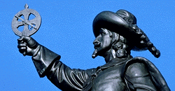 Another kind of astrolabe was a navigational astrolabe. The astrolabe allowed a sailor to determine his latitude--the north-south position. To do this, the sailor would align the horizontal axis of the astrolabe with the horizon. He then pointed it at the sun and read its position on the outer disk. He could then find his latitude by consulting an astronomical table (usually in a book). You can read more about The Mariner's Astrolabe at http://www.astrolabes.org/MARINER.HTM |