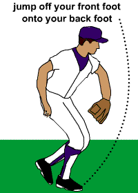 Trouble Transitioning? If you have a tough time transitioning from fielding the ball to taking the jump step, make sure you pick it up just outside of your glove-side foot. Practice jumping off your front foot and onto your back foot, keeping good tempo and body control. |