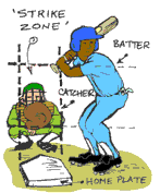Each of the pitcher's throws toward home plate is called a pitch, and the pitcher generally tries to throw the ball over home plate within a specified area. Also at home plate, standing behind the catcher, is a game official unconnected with either team. This is the umpire, who decides if the pitch is within a specified area called the strike zone. If it is within the strike zone, the umpire calls it a strike. If it's outside the strike zone, he calls it a ball. You'll understand the importance of these terms in a moment. |