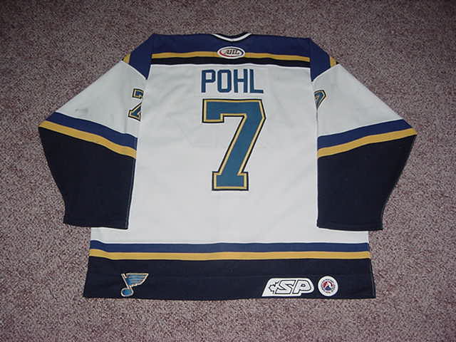 2002-2003 game worn road Worcester IceCats jersey. The jersey is a size 58 and made by SP. This jersey has good wear with puck marks, a few rips, blood, a shortened fight strap, moderate fight abuse and is autographed. It has a Peterson Oil patch on the upper right chest, and a St. Louis Blues logo on the bottom back hem.