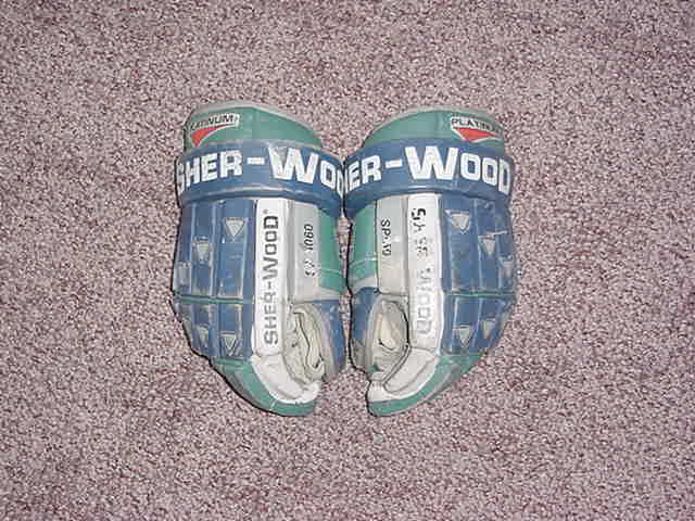 This is a pair of Harry York game worn Sher-Wood SP 5060 Platinum gloves. These gloves have great wear, with a few holes in the palms. These gloves were worn in 1995-96 when Harry was with the Worcester IceCats.