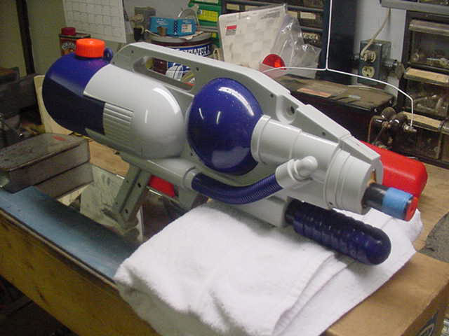 If you were to take this gun up against a CPS-2000, you wouldn't quite be able to stretch the stream 60 ft in a nice downwind, like the 2000, but for pure stream velocity, this blaster would murder the CPS-2000. I can say that, because I used a CPS-2000 to campare this blaster to!!!!! This gun shoots fast, and doesn't mess around when it comes to high-impact soaker wars. This weapon was meant to be used in one hit kills games. That is what it is designed around. Lets discuss this a little more in-depth. In one hit kills games, distance is not the ruling factore, power is. That is, power VS. time. You want to squeeze every little bit of power you have into the smallest shot time imagineable, because in OHK, all it takes is one hit. That goes both ways...it takes one hit to get someone out, but if you miss...all it takes to get you out is one hit as well, so you need to fire, and fire fast, and get moving. Well, this soaker fires fast. With an estimated shot time of .5 seconds, it delivers it's payload in a way no other soaker can, and it delivers it in a way that your opponent will remember. Now, why is it that I said in a OHK game, distance is not as important? That is because for any soaker, the stream breaks up at a certain point. The last thing you want in a one hit kills game is for someone to argue about if the shot was legal because they felt some mist hit them but can't see a wet spot and you say they're out and blah blah blah... You get the picture. When you play, you want someone to KNOW they got hit, none of this spray stuff. That is why you wan't to avoid shooting far distances in a OHK game, unless your a sniper, and you can get in a position to lay down some heavy water on someone. After I got over my initial excitement of the 12000, I thought about it for a while, and I wondered if I could move the 12000's internals into a CPS-1000 body, since the CPS-1000 has smoother lines, and is more compacts, and over a more classy design. Well, the 120000's internals wouldn't fit inside the limited space of the 1000, so I decided to do the 12000 mod to the 1000, and so it has become the CPS-12000/1000, a variation of the same mod to a CPS-1200, only it's on a CPS-1000. The CPS-12000/1000 on the bench The CPS-12000 mod include a check valve freeze, to take any limitations of the blaster's HPL. The CPS-1200 has such a high stock HPL that I didn't even need to mod it at all. THe 1000, on the other hand, had a very weak HPL, and the check valve would squeal even if you just pumped the stock blaster a little faster than normal. So that part was taken care of. Next, the Pressure chamber was modded. I will leave out the details of that on this page, as they are described elsewhere. The nozzle was then very carefully drilled out to around 12X, while keeping the mesh inside the nozzle intact(VERY IMPORTANT!!!) Everything was hooked back together, and the blaster was in the testing phases. Since then, there have been many tweaks to it, and a few more mods planned which will help the system deal with the power better. Comparitively, it doesn't compare. Or I should say other blasters don't compare to it. I remember firing a stock CPS-1000 VS. a Monster X, and I thought the Monster X was weak. hehe, so then I get used to a CPS-12000 and go to a stock 1200 or 1000, and I almost can't believe how weak these blaster were in comparison!!! wow. As for both ends of the spectrum, the MX and the 12000/1000, I have some photos of both the blasterr firing. You tell me what you think.