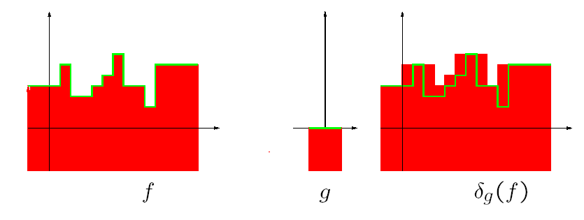 Grayscale dilation with a flat disk shaped kernel will generally brighten the image. Bright regions surrounded by dark regions grow in size, and dark regions surrounded by bright regions shrink in size. Small dark spots in images will disappear as they are `filled in' to the surrounding intensity value. Small bright spots will become larger spots. The effect is most marked at places in the image where the intensity changes rapidly and regions of fairly uniform intensity will be largely unchanged except at their edges. Figure 3 shows a vertical cross-section through a graylevel image and the effect of dilation using a disk shaped kernel.
