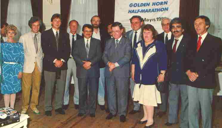 AIMS Board Members at Istanbul meeting held on May 12, 1989. From left to right; Olga Hansen(Milwaukee) ,Manfred Steffny(Frankfurt),Mario Kadiks(Rotterdam), Andy Galloway(Hamilton/New Zealand),Kadir Akpınar(Mayor of Eyup/Istanbul),Fred Lebow(New York),Jose Castro(Manila),Robert Dalgleish(AIMS President,Glasgow),Peter Christ(Berlin),Sue Richardson(London),Len Luchner(Boston),O.Atakan Tekin(Istanbul),Ted Paulin(Melbourne)