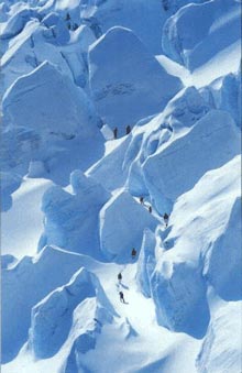 Tied together with rope we strapped on the ice spikes and began the climb over, and INTO, the glacier!