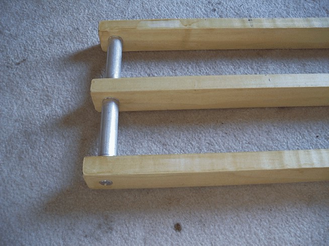 The aluminium tubes are used to assemble the three long pieces of poplar to form the back of the chair. At the top of the back, shown here, the 1/4-20 bolts are countersunk into the wood to allow the seat to slip over. |