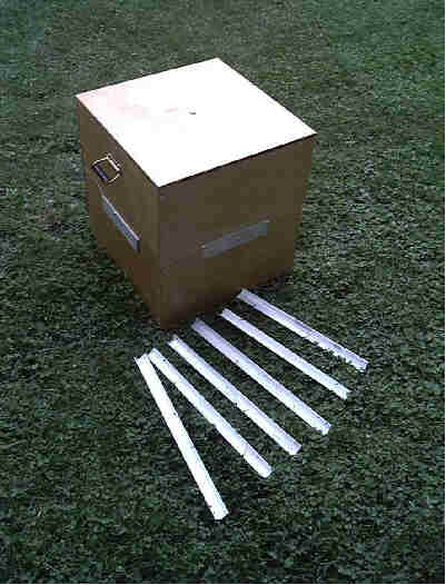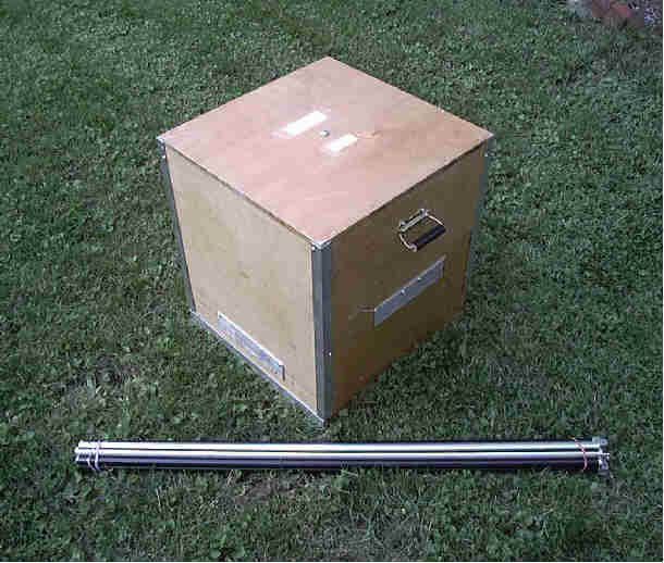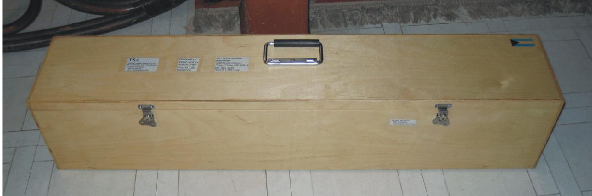 from another box, makes it easy to pick up. However, nowadays the TSA freaks out with such a box. So I built a new one from 1/4" Baltic Birch (44x8x9) that has clasps and a combo lock that they can open. Hoping to have less problems with this setup. 2011 update: This new box works great having been to Australia, Costa Rica, the Bahamas, and Chile with it. |