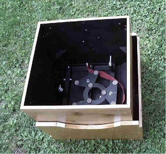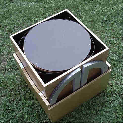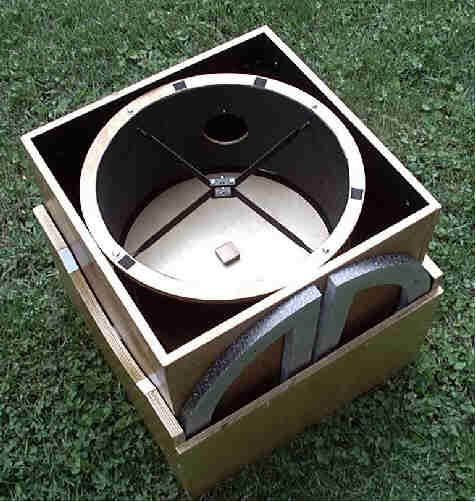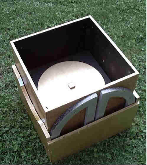 are 17" in diameter which is the same size as the mirror box. A strip of 1/2" ply (not shown) fits snugly between the two bearings during shipping. This eliminates any flopping around during transport. Thin foam packing material is placed between all wood surfaces to cushion the blows of the baggage handlers. there was no damage to the scope in transit to and from Australia, other than a few minor scratches to the rocker box. |