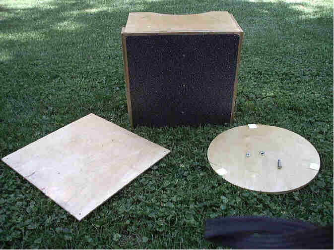 Left: Start with the rocker box (seen from the top). Right: (seen from the bottom) Then remove the ground board (the 17" round 1/2" ply at right) and bolt a square of 1/4" baltic birch (at left) to the bottom to protect the formica (Ebony Star) from airline baggage handlers. Brass threaded inserts in the bottom of the rocker box accept 10-32 bolts. This bottom piece of 1/4" ply is vital to shipping as it gets a lot of heavy abuse and is badly scarred. Also the use of grade 5, or better grade 8 bolts on the bottom is recommended since the shoving of the heavy box on ordinary bolt heads results in removal of the slot for the screwdriver, making removal of the bolts on the other end difficult.
