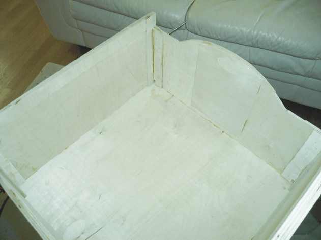 The corners are all reinforced with a double layer of 1/4" ply. A double layer is also seen on the bottom edge (the top as seen in this upsidedown photo. Also a double layer reinforces the curved edges to strengthen the section which is used to bolt the top and bottom of the box together and to provide a strong region for the handles. |
