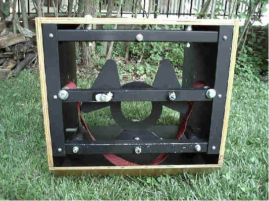 NOW -2006- The TSA is not liking the fact that these boxes are not easy to open and inspect. So, I got rid of the cardboard box for the truss tubes, etc. and made a box of 1/4" Baltic Birch for the truss tubes, disassembled mirror cell, altitude bearings, etc. etc. etc. It is 44" x 9" x 8.5" and is less than the 62" maximum allowed. Corner bracing of 1/2" wide triangular strips of poplar were glued in all corners. The length of the braces was usually as long as the corner. i.e. a strip runs the full length of the box in the bottom front and bottom back, sides etc. It weighs nearly (but not quite) 50 pounds packed.