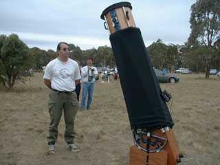 Friday morning dawned with the clouds just clearing up and my telescope actually arriving at 7:00 am with no damage. To ship the scope, I had to pretty much completely disassemble it so I spent the morning re-assembling it under the intense Australian sun. As the day progressed, many more astronomers and scopes arrived and the field began to fill up. In the end there were about 150 scopes and about 400 attendees. Walking across the field at noon a fellow read my name on my name tag and asked if I had stayed at Protea Farm this week. I acknowledged that I had and he introduced himself as Anthony McFadyen. Anthony and his fiancée, Sarah, had stayed at Protea Farm the night before and had learned from the caretakers about the poor American whose telescope was in limbo. As the afternoon waned and the bright blue sky began to shade towards midnight blue, the excitement amongst those on the field was noticeable; but clouds began appearing in the north.