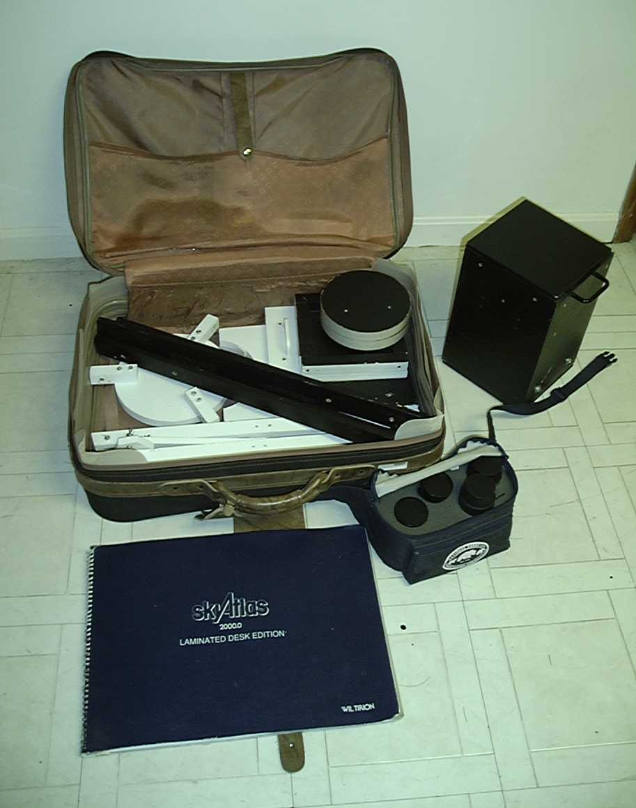 At this point I faced the daunting (to me) challenge of building the telescope and mount. This appeared difficult to me as I had no wood-working experience or big power tools such as a drill press and table saw. Jerry Schnall, however, came to the rescue once again. The workshop at Chevy Chase Community Center has many wood-working tools and the workshop at American University has many metal-working tools. Using these tools, and Jerry's expert help, I cut the wood for my mirror box (8x8x10 which carries on the plane and stows under the seat), rocker box, and tripod. With a few iterations, these each came out OK and assembled and dissassembled in about 30 minutes. I then talked to Jerry about how to cut good circles of wood to use as altitude bearings. He introduced me to the lathe and we made two perfect 7-inch wooden circles whose edges I surfaced with formica and attached to the mirror box with bolts that allow detaching for transportation. The formica surfaces of these altitude bearings ride on teflon pads which I attached to the rocker box in the classical Dobsonian fashion. Similarly, the the azimuth bearing was generated by surfacing the bottom of the rocker box with formica which rides on teflon pads attached to the top of the short (23") tripod. Although most Dobsonian telescopes do not have tripods, the 'tube' of my short-focus telescope was only going to be 30" long and to avoid having to be on my knees to observe, the tripod was added. Lastly, I had to consider the secondary mirror and focuser. In talking with Jerry he convinced me it is not worth trying to make a secondary mirror so I bought one from Orion. Jerry had made a single stalk support for such mirrors from brass which I attached to a flat board along with an excellent 2" focuser I purched from Astro Systems. Two hardwood trusses were made that attach the focusing board to the mirror box. Using directions in Richard Berry's book, with modifications suggested by Jerry, I built a mirror cell and glued in the primary mirror. I bought some black rip-stop nylon, learned the rudiments of sewing, and made a shroud supported by four threaded posts that blocks stray light from entering the eyepiece. Finally, I was finished and it was the weekend after Thanksgiving (1997). One year of fun!