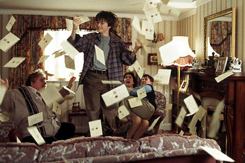 This is the scene where all of the letters came rushing down the chimney and Harry struggles to catch one. Whenever I read this part of the book I always wonder why Harry doesn't pick one up from the ground... Oh well... It worked out in the end.