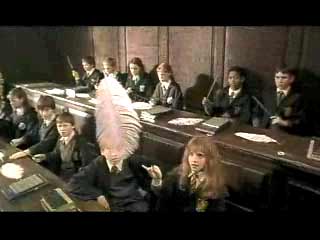 Here is where Hermione is the first one in the class to successfully levitate a feather.