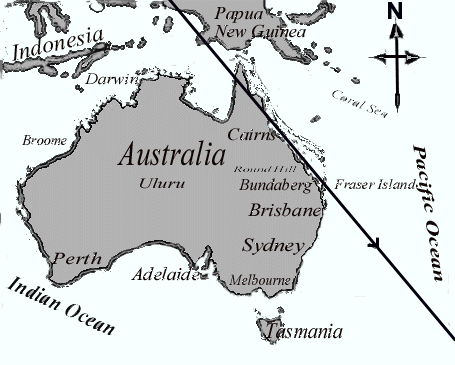 The ground track of MIR crossing the Queensland coastline if reentry is delayed by 2 orbits