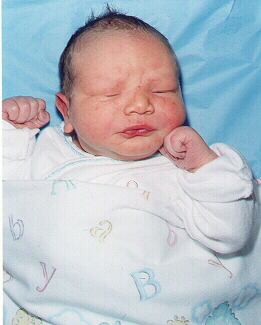 Halfway through the process of pushing, I fell asleep for one minute. I also started getting the shakes from the epi while pushing. Finally, at 2:48 am on June 2nd, 2000, Hunter Sadgwar Johnson made his debut into the world. He weighed 8 lb. 11 oz. & measured 20 1/2 in. His Apgar scores were 8 & 9. While the nurse was tending to Hunter, the OB was massaging my stomach to get the placenta out. Let me tell ya, it felt pretty damn good!!! I didn't get up to my recovery room till about 5:30 am on the 2nd. Can we say TIRED???? I fell asleep for a couple of hours, but then was back up again to feed Hunter. And that's the birth story of Hunter.