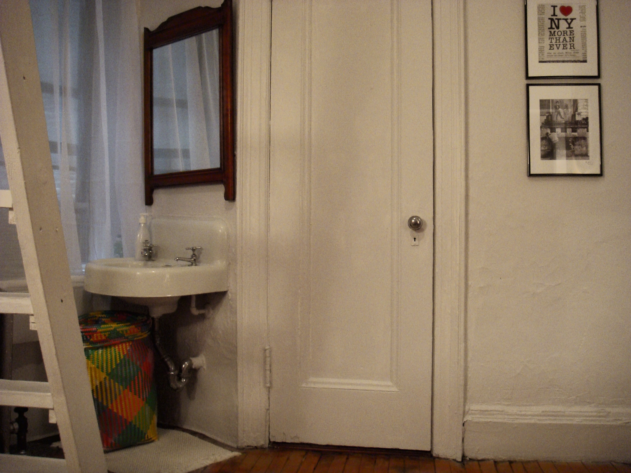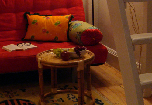 This space is about 180 sq.ft. with a bathroom and efficiency kitchen. A small built in closet and a loft bed. Some of the walls were covered with a lacy material to hide imperfections and the studio was furnished with recycled materials and furniture, to scale with comfort, efficiency and the environment in mind.