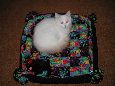 Here are a couple of examples of the cat quilts that I have to offer. Pictured below is Cinnimon who loves his quilts! The sizes are 28"X 28". Each one is handmade from 100% cotton in the Biscuit pattern. Sorta like bunches of little pillows sewn together, giving it a puffy effect. These quilts can be machine washed in cold water and tumble dry low.