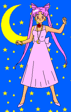 Rini is little, loud, and sometimes annoying. She lives in the future, and is the daughter of Neo-Queen Serenity and King of Earth, Serena and Darien's future selves. When her home, Crystal Tokyo, was attacked by the forces of the Negamoon, and her mother was frozen in sleep, she went to the Tokyo of the past (our present) to find the Silver Crystal of the past. If she found it, the negamoon could be defeated, because the Silver Crystal of the future had disappeared. Sailor Pluto, who Rini affectionately calls LunaP or Puu helped her travel through time. Pluto kept watch over Rini through the Luna Ball, a toy cat's head that follows Rini wherever she goes. Rini would often talk to Pluto through the Luna ball, to ask for help and advice. When Rini came to our present, she fell out of the sky, right on top of Serena and Darien. Serena immediately remarked at how much the pink haired girl looked like her. Rini yelled at Serena to give her the Silver Crystal, which made both Serna and Darien think that she might be from the Negaverse. Meanwhile, Rini managed to brainwash all of Serena's family (except Serena) into thinking she was a cousin visiting from out of town. Needless to say, Serena was very peeved about this. She can't stand the 'pink haired spore,' but for some reason she feels drawn to protect her. When Rini was in the past/present, evil villains from the Negamoon kept stalking her and trying to catch her. When she'd get sad, scared, or in trouble, she'd start crying her head off . That would make a little crescent moon appear on her forehead and she'd send a huge beam of purple light into the heavens, called the moon beam. This beam of light often told the Negamoon villains exactly where to find her, but it also helped the Sailor Scouts know when she was in trouble. Little did Rini know, the reason the Negamoon villains were after her was because the Silver Crystal had somehow transferred inside her body, which is why it had been missing from the future. Rini had thought the Crystal had been stolen, and that was why she was in the past looking for it. One day when Rini was being a little snoop, she accidentally saw the Scouts transforming. She was totally disappointed to find out Serena was Sailor Moon, because she thought Sailor Moon was a nice person and Serena hates her guts. Finally, Rini told the Scouts about how Crystal Tokyo was being attacked by the Negamoon, and all the Scouts agreed to go to the future and help out. Rini used her Crystal Key, and transported herself and all the Scouts to Sailor Pluto's time gate. Pluto opened the door to the future for them. There, they were told by Darien's future self, King of Earth, that Rini was Serena and Darien's daughter of the future. In the future, Rini wandered away from the Scouts and met Wise Man, a powerful leader of the Negamoon. He led Rini to believe that nobody loved her, and that she was unwanted. He said he'd help her avenge those who didn't love her. Wise Man turned her into Wicked Lady, which made Rini age rapidly, from 5 to 20. She fought against the Sailor Scouts until they convinced her she was truly loved and wanted. When she realized she was cared for, she grew young again. Right after Rini got good again, Wise Man attacked the Scouts. Serena turned into Neo-Queen Serenity and used her Silver Crystal against him, but it was not enough power to defeat him. All the Scouts pooled in their power, but it still wasn't enough. It was right then that Rini realized the Silver Crystal had somehow transferred into her body. Rini then turned into Neo-Princess Small Lady and used her Silver Crystal to fight along side her mother. The Silver Crystals of the Present and Future together destroyed the Wise Man. After long goodbyes, Rini went back to Crystal Tokyo, which was once again beautiful and fully restored. In the next season, Sailor Moon S, Rini returns to the present so she can go to a normal school. When she returned, not only has she matured, she had her own powers. She was now Sailor Minimoon, scout in training. She fights along side Sailor Moon because her powers aren't powerful enough by herself, they're mostly for the purpose of driving the enemies nuts. The 4th season of Sailor Moon is heavily based around Rini, it tells a sweet love story between her and a boy named Helios. This all started when Rini began to have beautiful dreams about a tranquil forest and a majestic Pegasus. In real life, the Dead Moon Circus had come to earth to find and capture that Pegasus. The Pegasus hid out in the beautiful dreams of humans, and the Dead Moon Circus had to find the dreams that the Pegasus was in. They needed to capture Pegasus and get his horn, because the horn held a special crystal that would allow the evil Queen Neherinia to enter this world and take it over. The Pegasus was hiding for this very reason. One evening, the 2 Moon girls were out walking and they saw a member of the dead moon circus, Tiger Eye, attacking Andrew's (the cute guy from the Arcade) little sister. They transformed and went to her aid. They were having trouble beating this enemy, and Chibi Moon called out for somebody, anybody, to help them. That's when Pegasus appeared. He charged up Sailor Moon and Sailor Chibi Moon into Super Sailors and gave Sailor Moon a new weapon, her Kalide Moon Scope. Super Sailor Moon then used Moon Gorgeous Meditation for the first time. Rini was so excited that Pegasus responded to her call. Rini and Pegasus became very close, he would visit her in her room every night and they would talk about matters of the heart. The two had a lot in common. Chibi Moon would call on Pegasus in battle by using her Crystal Twinkle Bell. Pegasus turned out to be a young boy named Helios. He and Rini fell in love, and he gave Rini her first kiss. Helios had to go back to where he came from, though, but Rini will always cherish his memory.