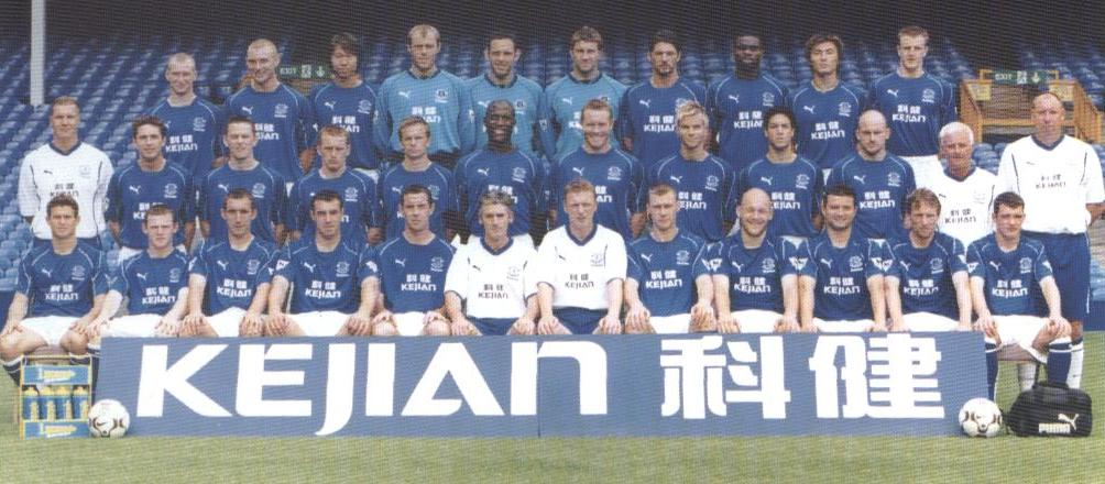First Row: Rodrigo, Wayne Rooney, Alan Stubbs, David Unsworth, David Weir, Alan Irvine (assistant Manager), David Moyes (Manager), Duncan Ferguson, Thomas Gravesen,Tomasz Radzinski, Scot Gemmill, Kevin McLeod
