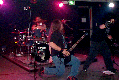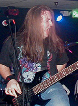 favorites and why ? I play primarily my trusty BC Rich Warlock with EMG pickups, for a few reasons, it sounds sweet, it looks sweet, and it practically never goes out of tune no matter how hard I beat it up. I use Hartke for amplification because out of the rigs I have tried out and played it gives me the best sound I have heard, very clean, yet rumbling your guts at the same time.Eric (our guitar player) uses Jackson guitars and Marshall amplification. He get's a really killer tone, and I would not want it any other way. |