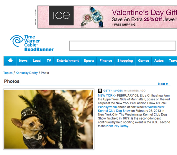 Eli in Time Warner Cable Roadrunner coverage of the New York Pet Fashion Show, 2/13