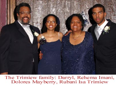 We have two adult children. Our daughter, Rehema Imani Trimiew is 26 and a graduate in the class of 2000 from Bryn Mawr College. She is presently a student at Rochester Institute of Technology and is in the graduate school of film. She has been a Sister Cities Ambassador and has traveled to more than 10 countries. Our son, Rubani Isa Trimiew is 22 and graduated from Morehouse College in 2004. He is an admissions counselor for Phillips Academy in Andover, Massachusetts. Rubani was a contestant on Teen Jeopardy in 1999 and won second place.