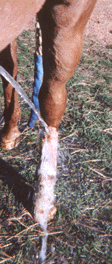 Jake's Injury*WARNING* This page contains some graphic photos of my horse's leg injury.On April 24, 2001, Jake caught his leg in a high tensile electric-wire fence and cut his leg down to the bone and tendon. He was placed on stall rest for two weeks, with the leg wrapped. As you will see in the following pictures, he has progressed quite rapidly.