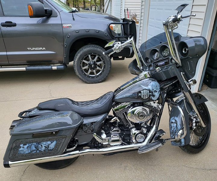 Here's a nice Road King with Traditional, "Hot Rod" flames, with Real Fire. Gansta' Skull