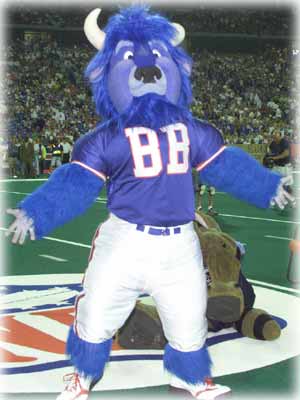 Height: 8 stacked footballs high Weight: 600 lbs College: Yeah Right Birth Date: 9/03/00, Orchard Park, NY Residence: Ralph Wilson Stadium Full name--William The Buffalo…enjoys supporting the Buffalo Bills year 'round. Billy lists signing autographs, playing with kids, and eating Buffalo wings as some of his favorite things to do. Billy will be the first to remind people that Buffalo wings are made of chicken and only called Buffalo wings because they originated in Buffalo. Ralph Wilson Jr. saved Billy from a bison reserve in Florida after his herd shunned him because of his unusual royal blue color. Housed in Ralph Wilson stadium, Billy soon became a fast Bills fan. Billy is the only animal allowed inside the stadium, and represents the Bills as the official team mascot. Billy skipped the college ranks and went straight to the Pros to represent the Buffalo Bills, the winningest team of the 1990's. Billy begans his first year as an official NFL Mascot in 2000. He made his debut for the Buffalo Bills in their home opener against the Tennessee Titans.