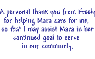 Window Decal stating "Proud Sponsor of a Service Dog A Photo of the Service Dog Team A Certificate of sponsorship showing support of a person in the community with a disability. A listing on Mara and Freely's Brochures and Handouts as "Proud Sponsors" . These are distributed at Mara's speaking engagements. A listing on THE PROUD SPONSORS page of this website and Freely's website. Regular updates on Training, Certification, and the working Team. Free presentations about Service Dogs and Animals at your business, school, organization, or place of your choice. See the flyer on these inclusive presentations for all age levels. If in local area (WA or OR). The Service Dog Team presence at your special events. If in local area (WA or OR) Calligraphy and/or Public Speaking services by Mara. See Mara's website. Distribution of your business cards to persons or groups when appropriate. Free Service Dog information. Listing on poster of "Sponsors" to be posted at Mara's speaking engagements. Other ideas we may discuss....