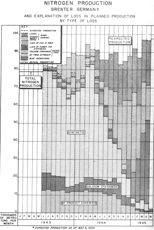 The heavy, repeated attacks did not begin until May, 1944. Figure 3 shows the over-all nitrogen production by processes from the middle of 1943 to May, 1945. It also shows production of synthetic nitrogen for the same period at Leuna, at Oppau, and in other synthetic plants. Table A5 gives the monthly synthetic nitrogen production for each of the more important plants and the total synthetic production with dates of air attacks. The first dip in the German production curve in late 1943 resulted from the effects of the first bombing attacks on Oppau superimposed upon the normal seasonal slump in calcium cyanamide production. This slump came about from curtailment of carbide production when power was diverted to winter demands. Production recovered completely and was as high in March and April, 1944, as it ever had been previously (Figure 3). From the beginning of the attacks on oil plants in May, 1944, nitrogen production plummeted in January, 1945, to about 11 percent of April's production; 95 percent of the synthetic nitrogen production was lost.