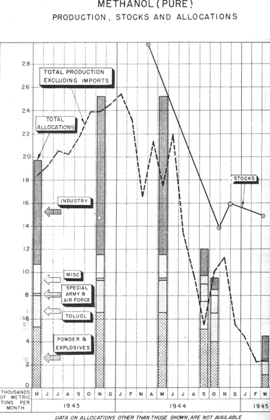The anticipated requirements, production, consumption, and stock position of Germany are given in Table A16. Consumption closely approximated production, and the stocks remained substantially constant with a backlog of about 6 months' consumption until March, 1944, when consumption began to exceed production. After July, 1944, decline in production showed the effect of the bombing of the ethyl chloride plants supplying this raw material. The slight increase in stocks after August, 1944, was not due to an increase in tetraethyl-lead production, but rather to the fact that the production of gasoline (and hence the use of tetraethyl lead) was deteriorating even more rapidly.