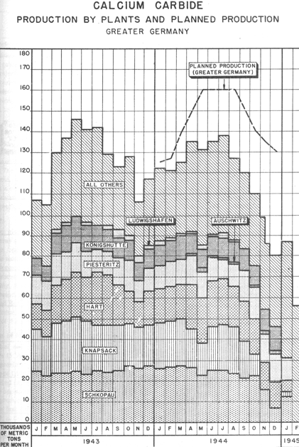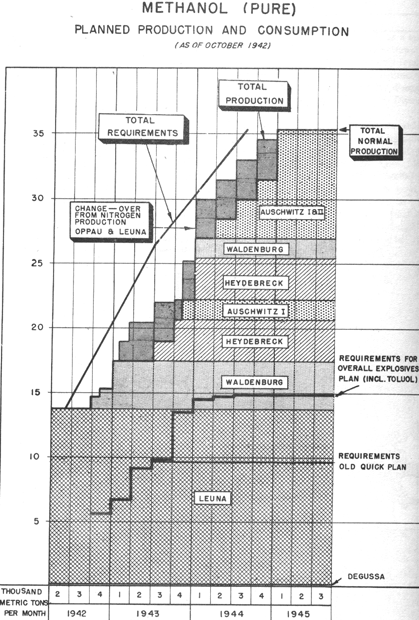 After 1942, production fell short of plans because of (a) delays in the construction of the Heydebreck I plant, and difficulties in its operation, (b) cancellation of the construction project for three large plants (Heydebreck II, Koenigshuette II, and Linz II), (c) loss from air attacks, (d) a shift in production at Leuna from synthetic ammonia to methanol and aviation gasoline, and (e) the sacrifice of cyanamide in favor of ethylene, as shown in Table A4.