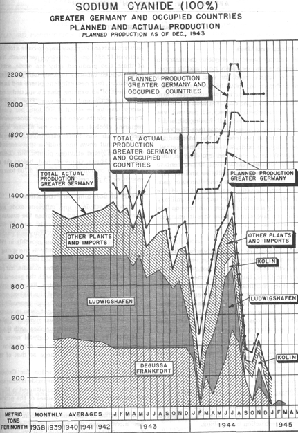 Germany's production rose, as shown in Figure 26, from about 90,000 tons monthly before the war to 135,000 tons monthly early in 1943. Supplies of about 30,000 tons monthly weree also available from France and other occupied territories. In July, 1944, the German prodution was 130,000 tons, but thereafter dropped precipitously to only 20,000 tons in February, 1945. An undetermined part of this decline is attributable to direct bomb damage to the Rheinberg, Koeln-Kalk, Duisburg, and Heilbronn plants. Loss of the Hohensalza plant in the east contributed to the loss, but the greater part of the decline is attributable to lack of coal and power, shutdown of consuming industries, breakdown of transportion, and other factors in the general deterioration of German industry that occured at this time.
