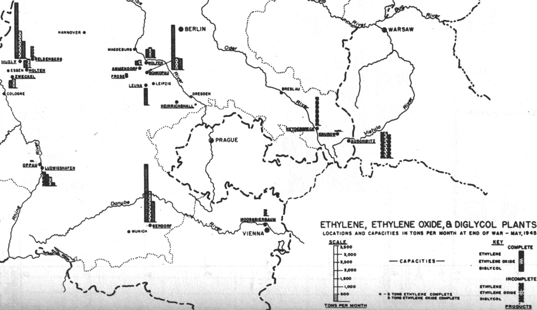This industry was particularly vulnerable to air attacks. Both tetraethyl lead and ethylene dibromide plants handled highly reactive and inflammable materials. Both used special equipment which would take several months to replace. Part of the ethylene dibromide equipment was very fragile. Germany depended entirely on only three small plants for its total requirements.