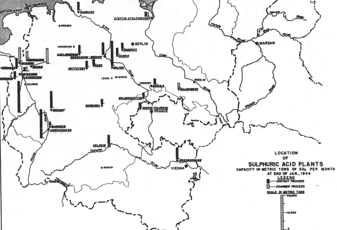 Sulfuric acid was highly essential, and no stocks existed to offset loss in production. However, the industry was dispersed among many plants, and an appreciable portion of normal production went into only moderately critical uses which could be eliminated in order to supplement the supply for vital uses. For these reasons sulfuric acid plants did not rate top priority as bombing targets.
