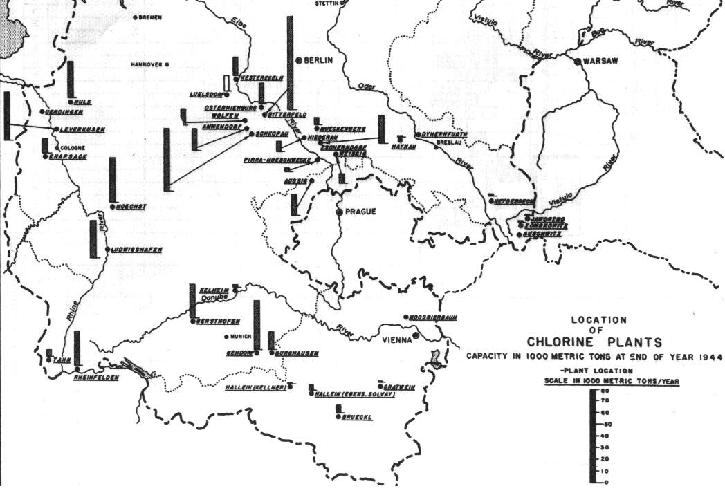Though of a wide importance in many industries, chlorine does not appear to have been a particularly critical item to Germany. Further, production was relatively well dispersed in many plants. Therefore, the industry was not a strategic bomb target of high priority.