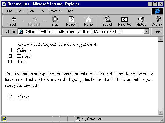 image to see a bigger and clearer version "type=?" You can customise your ordered lists by using the type attribute of the <ol> tag. There are five options for this attribute. They are Type=1 Result=1, 2, 3, 4, 5 (this is the default) Type=i Result=i, ii, iii, iv, v Type=I Result=I, II, III, IV, V Type=a Result=a, b, c, d, e Type=A Result=A, B, C, D, E the start attribute It is possible to interrupt your list with text and return to it later by using the start tag. To use it, simply set its value to the value you want the list to start at. If you are not using the default type setting then you must specify the type in the <ol> tag too. The following Notepad viewer and resulting Explorer view will hopefully help those who are still kind of confused about the type and start attributes.