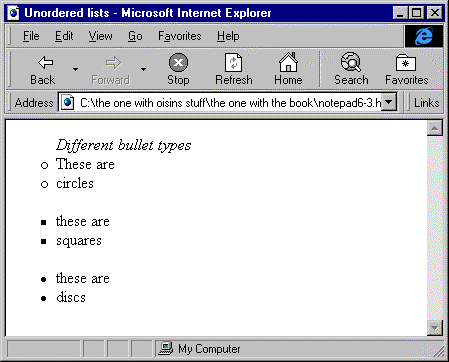 image to see a bigger and clearer version creating unordered Lists Unordered lists or bulleted lists are started with the <ul> tag and ended using the </ul> tag. Once again the <lh> and <li> tags are used to enter data. Type is the only attribute of the <ul> tag and there are three options for this. They are square, circle and disc. The following Notepad Viewer and corresponding Explorer View show you how to use the <ul> tag and display all the types of bullets.