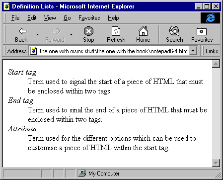 As you can see, I started off with an ordered list that contained 2 items. Each of these items then had an unordered list containing 2 items. One of these items then had a definition list. On the next page you will see how these lists are presented in Internet Explorer 4. |