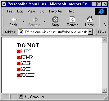 Explorer View 6.5 - click on the image for a bigger and clearer version Notice that I also used some of the physical formatting tags that you learned about earlier on. personalising your lists When using unordered lists you can choose an image to use as your bullet simply by removing the <li> tag and replacing it with: <img src= "image.gif"> Make sure that the image is not too big or it might take time to download. Remember too that you now must include the <br> tag at the end of each item. In fact all you are doing is using the <ul> tag to indent the list. It serves no other purpose. The list would look exactly the same if you didn't use it except that it wouldn't be indented. |