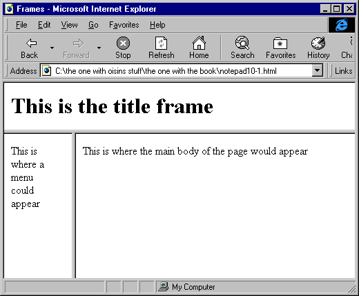 NOTE: WITH ROWS YOU ARE SPECIFYING THE HEIGHT AND WITH COLUMNS YOU ARE SPECIFYING THE WIDTH To tell the browser that the frameset contains rows type: <frameset rows= "100,*"> To tell the browser that the frameset contains columns type: <frameset cols= "*,3*"> To tell the browser that the frameset contains rows and columns type: <frameset rows= "100,*" cols= "*,3*> <frame> The frame tag has no end tag. There must be one frame tag for each frame. If there are two frames specified in the <frameset> tag then there must be two <frame> tags before the </frameset> tag. The only required attribute of the <frame> tag is "src=". This is where you enter the URL of the HTML document that will fill that frame. Absolute or relative reference can be used. To help explain this you should refer back to Notepad Viewer 10.1. In this document I presumed that" menu.html", "title.html" and "main.html" were in the same folder as "notepad10-1.html".