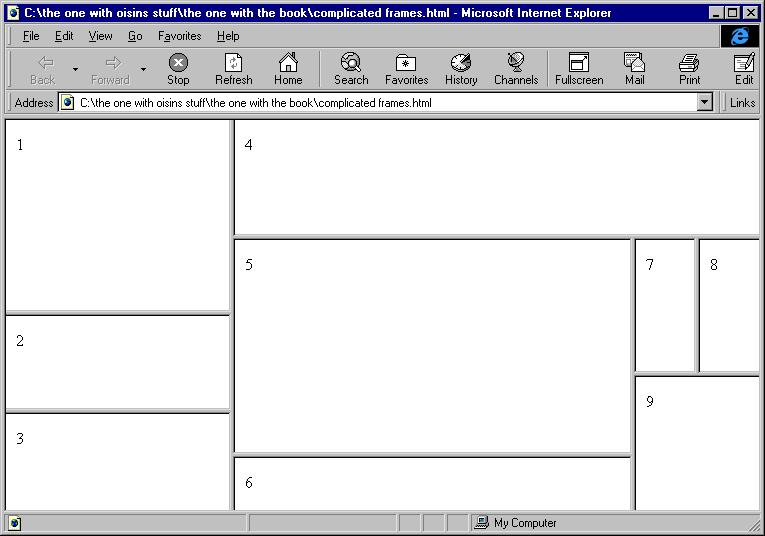 The first way is explained in Notepad Viewer 10.1 but I will try to make it clearer for those who do not understand. Notepad Viewer 10.2 specifies two rows in the frameset tag. The first row is set to display the contents of "top.html". The second row is set to display the contents of "bottom.html". The first step in changing this document to the way we want is removing the tag <frame src= "bottom.html">. The second step is replacing it with: <frameset cols= "20%,*> <frame src= "bottomleft.html"> <frame src= "bottomright.html"> </frameset> Its as easy as that. To see the complete listing, go back to Notepad Viewer 10.1. The second way is also quite easy. This time instead of removing "bottom.html" we edit it. Its source should read: <html> <frameset cols= "20%, *"> <frame src= "bottomleft.html"> <frame src= "bottomright.html"> </frameset> </html> Both ways will have the same result. Its up to you which one you use. You should now be able to create any combination of frames. Study this Notepad Viewer of very complicated frames. Try to sketch on a piece of paper what you think the finished page will look at. Then click on the anchor underneath to see if you were right.