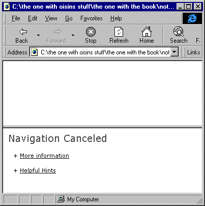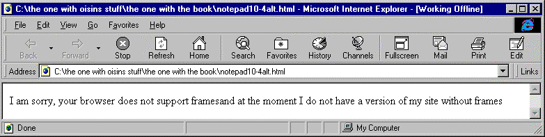 Explorer View 10.2- result of Notepad Viewer 10.3 Although the above is not an ideal layout for a webpage it displays the flexibility of frames and the ways in which they can be used to lay out your page almost any way you want. You can see above the way frames look when they have content (even if it is only one number). What would happen though if you specified either an unknown URL or no URL at all? Explorer View 10.3 shows both of these. The top frame has no URL reference at all i.e. <frame> The bottom frame has an unknown URL i.e. <frame src="unknown URL"> Explorer View 10.3 - click on the