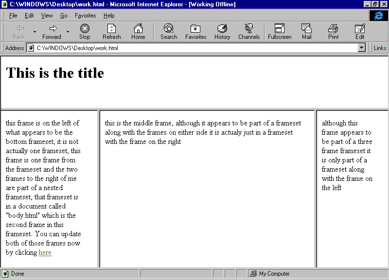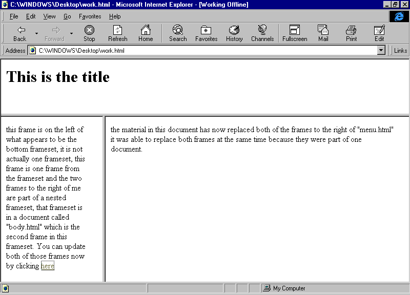 The document that resulted in this page was called "work.html", this document was a frameset document and set two rows, the first row was to contain the file "title.html" and the second row was to contain the file "main.html". "Main.html" was itself a frameset document and it set two columns, the first contained the file "menu.html" and the second contained the file "body.html". "Body.html" was named "nestedframeset" and had two columns, the first contained the file, "info.html" and the second contained the file "guide.html". The anchor in "menu.html" read: clicking<a href= "newmaterial.html" target= "nested frameset">here</a> Therefore when "here" was clicked, the two frames on the right, which make up "body.html" are replaced with "newmaterial.html". Look below if you do not fully understand, click on the image to see a bigger and clearer version |