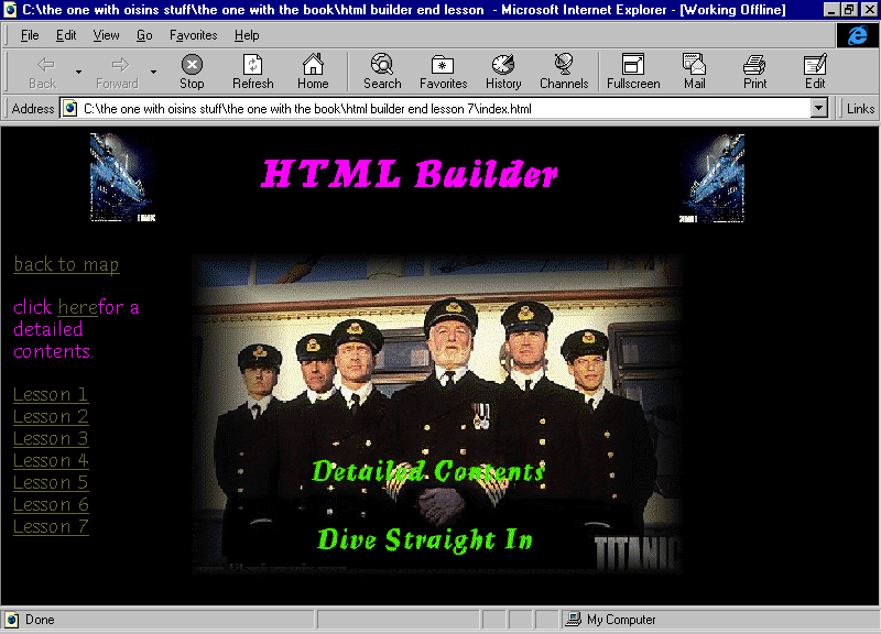 You will need two images to complete the html builder titanic_head.gif and proudm.gif. If you have downloaded this tutorial then you already have the files, if you haven't then you will have to download them now. Right-click on the links and choose "save target as..." or "save link as...", whichever appears (it will depend on your browser). Save the pictures in the same folder as your html builder file.